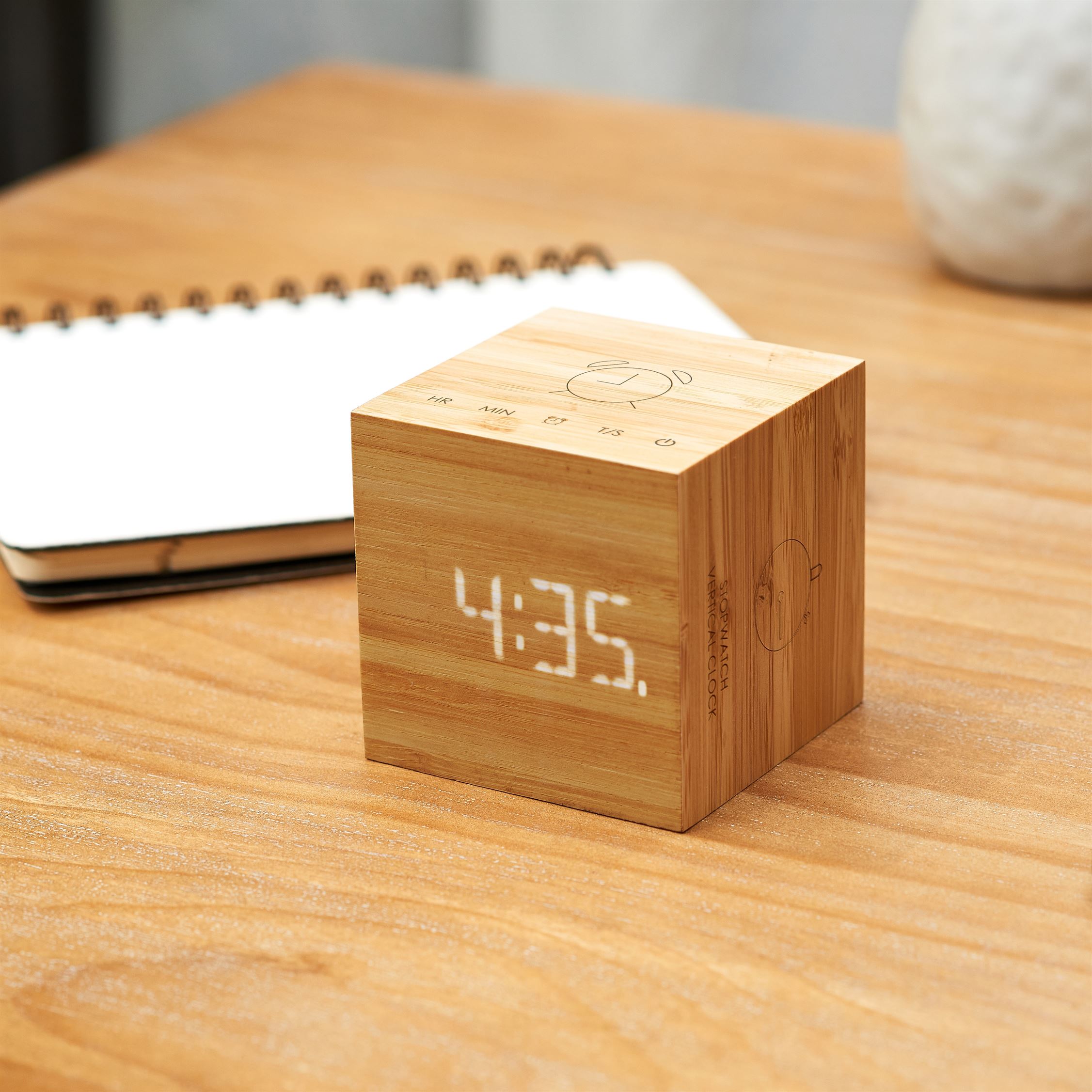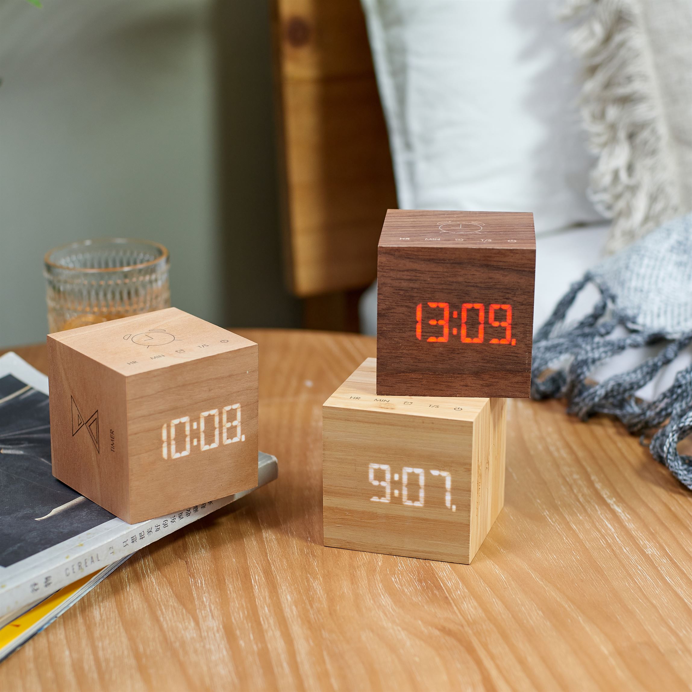 Made from a choice of natural woods including Bamboo, Cherry and Walnut, the Gingko Cube Plus clock combines a rechargable LED alarm clock with a timer or stop watch. Powered by a built in rechargable battery, the Gingko Cube Plus wooden alarm clock has a long runtime and can power the cube clock for 1 – 2 weeks with the display set to on or 2 months in sound activated mode. This clever LED cube clock automatically dims the display between 9pm and 7am maintaining just the right level of light from the display.