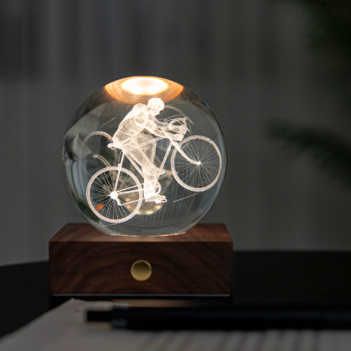 A 3D engraved cyclist rides encased within the Amber Crystal sphere.