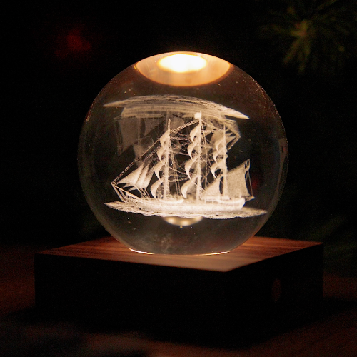 Enjoy this 3D engraved sailing ship captured inside a glass sphere and mounted on a rechargable wooden base.