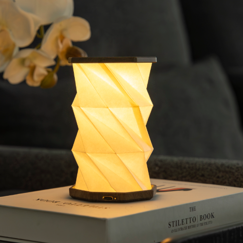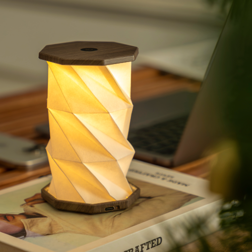 This is no ordinary light when not in use, the Gingko Mini twist Walnut drift hexagon light folds down to reveal the perfectly shaped hexagon design which can be supplied in a range of finished and colours. The flat side provides access to the USB-C charging socket while the luxurious wooden top houses the touch control for the light.